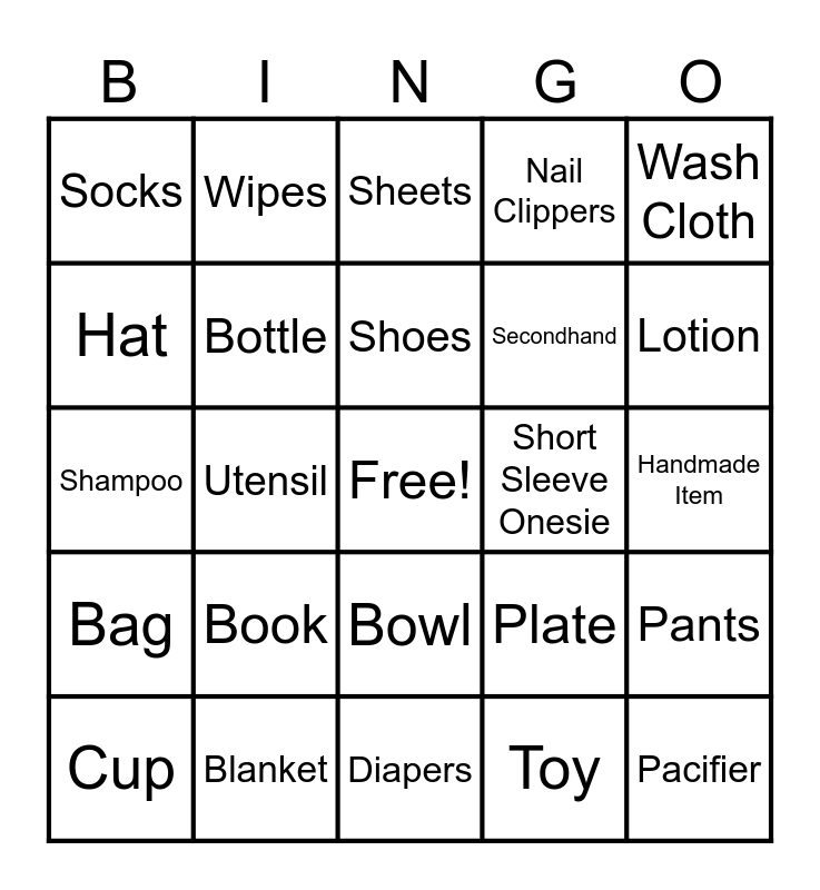 This bingo card has a free space and 29 words: Cup, Long Sleeve Onesie, Utensil, Brush, Socks, Sheets, Bottle, Book, Short Sleeve Onesie, Blanket, Handmade Item, Pacifier, Diapers, Toy, Lotion, Baby Carrier, Bowl, Bag, Wash Cloth, Shampoo, Plate, Jacket, Secondhand, Hat, Nail Clippers, Wipes, Pants, Shoes and Swaddle.
