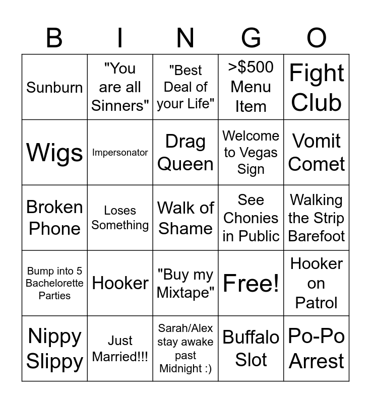 This bingo card has 25 words: Hooker, Sarah/Alex stay awake past Midnight :), Drag Queen, Nippy Slippy, Fight Club, Sunburn, Wigs, "You are all Sinners", See Chonies in Public, "Buy my Mixtape", Welcome to Vegas Sign, Broken Phone, Free!, Hooker on Patrol, Impersonator, Po-Po Arrest, Walking the Strip Barefoot, "Best Deal of your Life", Vomit Comet, Loses Something, Walk of Shame, Just Married!!!, Bump into 5 Bachelorette Parties, >$500 Menu Item and Buffalo Slot.