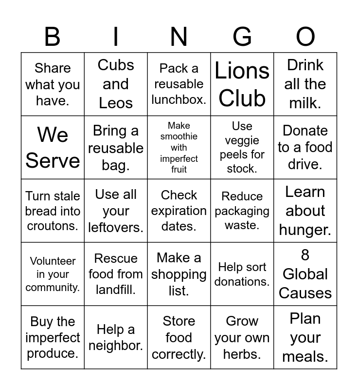 This bingo card has 29 words: Buy the imperfect produce., Compost your food scraps., Use all your leftovers., Plan your meals., Share what you have., Pack a reusable lunchbox., Bring a reusable bag., Rescue food from landfill., Reduce packaging waste., Help a neighbor., Learn about hunger., Check expiration dates., Store food correctly., Grow your own herbs., Donate to a food drive., Be a food champion., Make a shopping list., Volunteer in your community., Drink all the milk., Turn stale bread into croutons., Help sort donations., Freeze extra food., Use veggie peels for stock., We Serve, Lions Club, Cubs and Leos, 8 Global Causes, Make smoothie with imperfect fruit and Buy what you will eat check again.