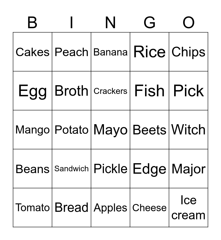 This bingo card has a free space and 24 words: Sandwich, Bread, Crackers, Tomato, Chips, Cakes, Egg, Peach, Beets, Pickle, Fish, Mango, Edge, Major, Broth, Cheese, Witch, Banana, Pick, Potato, Ice cream, Beans, Rice and Apples.