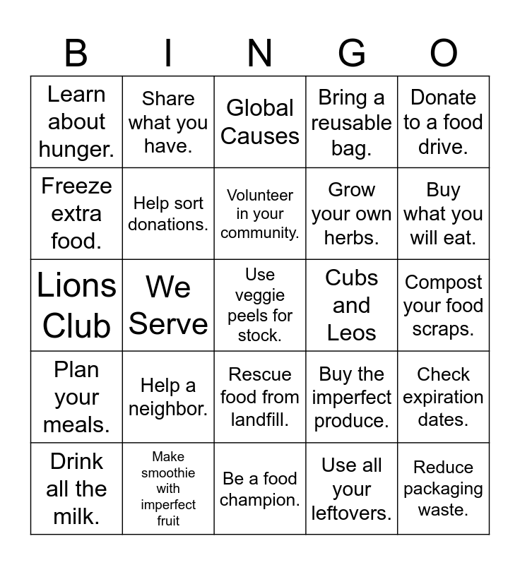 This bingo card has 29 words: Drink all the milk., Store food correctly., We Serve, Reduce packaging waste., Learn about hunger., Global Causes, Help sort donations., Help a neighbor., Cubs and Leos, Make smoothie with imperfect fruit, Compost your food scraps., Use veggie peels for stock., Be a food champion., Use all your leftovers., Buy what you will eat., Turn stale bread into croutons., Rescue food from landfill., Plan your meals., Donate to a food drive., Lions Club, Buy the imperfect produce., Make a shopping list., Grow your own herbs., Freeze extra food., Bring a reusable bag., Share what you have., Check expiration dates., Volunteer in your community. and Pack a reusable lunchbox.