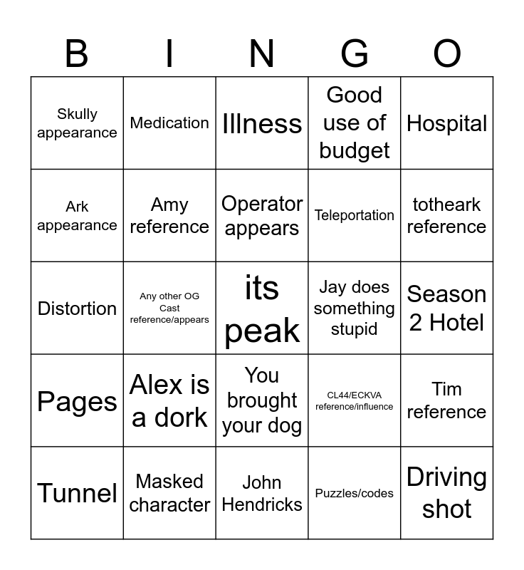 This bingo card has a free space and 24 words: Alex is a dork, Masked character, Operator appears, Tunnel, Hospital, Skully appearance, Ark appearance, Medication, Jay does something stupid, You brought your dog, Teleportation, Distortion, CL44/ECKVA reference/influence, Tim reference, Amy reference, Puzzles/codes, Season 2 Hotel, Illness, totheark reference, Any other OG Cast reference/appears, Driving shot, Pages, Good use of budget and John Hendricks.