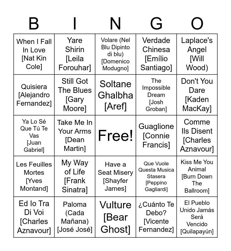 This bingo card has a free space and 24 words: My Way of Life [Frank Sinatra], Paloma (Cada Mañana) [José José], Soltane Ghalbha [Aref], Ed Io Tra Di Voi [Charles Aznavour], Laplace's Angel [Will Wood), When I Fall In Love [Nat Kin Cole], Quisiera [Alejandro Fernandez], Yare Shirin [Leila Forouhar], Guaglione [Connie Francis], Have a Seat Misery [Shayfer James], The Impossible Dream [Josh Groban], Ya Lo Sé Que Tú Te Vas [Juan Gabriel], Que Vuole Questa Musica Stasera [Peppino Gagliardi], Kiss Me You Animal [Burn Down The Ballroom], Still Got The Blues [Gary Moore], ¿Cuánto Te Debo? [Vicente Fernandez], Comme Ils Disent [Charles Aznavour], Volare (Nel Blu Dipinto di blu) [Domenico Modugno], Don't You Dare [Kaden MacKay], Take Me In Your Arms [Dean Martin], El Pueblo Unido Jamás Será Vencido [Quilapayún], Les Feuilles Mortes [Yves Montand], Verdade Chinesa [Emílio Santiago] and Vulture [Bear Ghost].