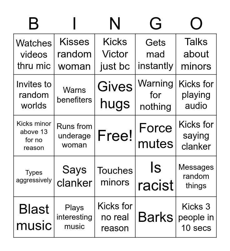 This bingo card has a free space and 24 words: Says clanker, Plays interesting music, Gives hugs, Blast music, Talks about minors, Watches videos thru mic, Invites to random worlds, Kisses random woman, Force mutes, Touches minors, Warning for nothing, Kicks minor above 13 for no reason, Is racist, Messages random things, Warns benefiters, Barks, Kicks for saying clanker, Kicks Victor just bc, Kicks for playing audio, Runs from underage woman, Kicks 3 people in 10 secs, Types aggressively, Gets mad instantly and Kicks for no real reason.