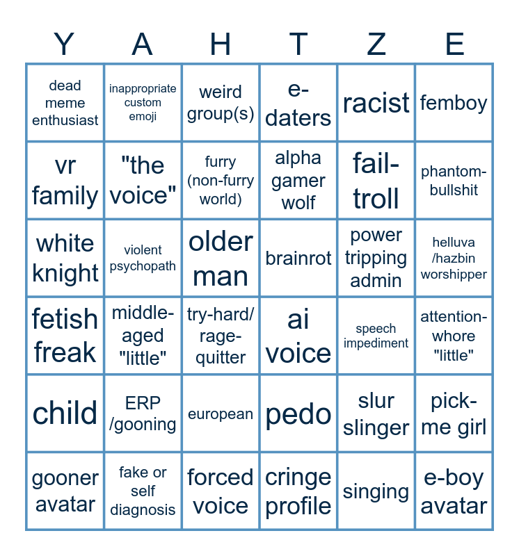This bingo card has 36 words: pedo, european, cringe profile, vr family, fetish freak, brainrot, "the voice", forced voice, racist, slur slinger, phantom-bullshit, e-daters, pick-me girl, violent psychopath, alpha gamer wolf, dead meme enthusiast, child, power tripping admin, white knight, weird group(s), older man, middle-aged "little", ai voice, try-hard/ rage-quitter, speech impediment, inappropriate custom emoji, fail-troll, fake or self diagnosis, furry (non-furry world), femboy, e-boy avatar, gooner avatar, attention-whore "little", helluva /hazbin worshipper, ERP /gooning and singing.