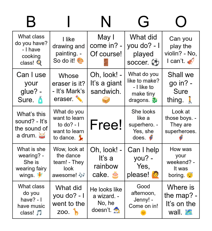 This bingo card has a free space and 30 words: What did you do? - I went to the zoo. ๐ฆ, How was your weekend? - It was amazing! ๐, What do you want to learn to do? - I want to learn to dance. ๐, Letโs do some afterschool activities. - Sounds fun! ๐จ, What class do you have? - I have cooking class! ๐ณ, May I come in? - Of course! ๐ช, Whose eraser is it? - Itโs Markโs eraser. โ๏ธ, Oh, look! - Itโs a rainbow cake. ๐, She looks like a superhero. - Yes, she does. ๐ฆธโโ๏ธ, He looks like a wizard. - No, he doesnโt. ๐งโโ๏ธ, Look at those boys. - They are superheroes. ๐ฆธโโ๏ธ, Where is the map? - Itโs on the wall. ๐บ๏ธ, Good afternoon, Jenny! - Come on in! ๐, What is she doing? - She is painting a cat. ๐๏ธ๐ฑ, Shall we go in? - Sure thing. ๐ถ, Do you need blue apples? - No, I donโt. ๐๐, Can I help you? - Yes, please! ๐, What is she wearing? - She is wearing fairy wings. ๐ง, Wow, look at the dance team! - They look awesome! ๐ถ, Can you play the violin? - No, I canโt. ๐ป, Whatโs this sound? - Itโs the sound of a drum. ๐ฅ, Cut the paper. - Okay! โ๏ธ, I like drawing and painting. - So do it! ๐จ, What do you like to make? - I like to make tiny dragons. ๐, Can I use your glue? - Sure. ๐งด, What did you do? - I played soccer. โฝ, How was your weekend? - It was boring. ๐ด, What class do you have? - I have music class! ๐ต, Oh, look! - Itโs a giant sandwich. ๐ฅช and What is he doing? - He is feeding the goldfish. ๐.