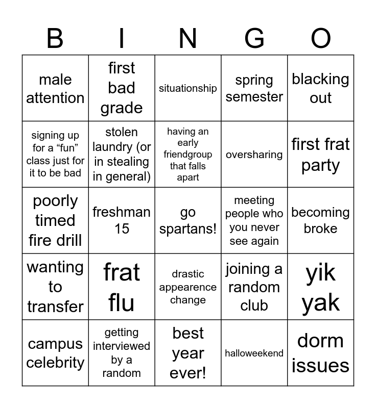 This bingo card has a free space and 24 words: frat flu, getting interviewed by a random, having an early friendgroup that falls apart, campus celebrity, blacking out, male attention, signing up for a “fun” class just for it to be bad, first bad grade, meeting people who you never see again, drastic appearence change, oversharing, poorly timed fire drill, joining a random club, yik yak, stolen laundry (or in stealing in general), halloweekend, becoming broke, situationship, first frat party, freshman 15, dorm issues, wanting to transfer, spring semester and best year ever!.