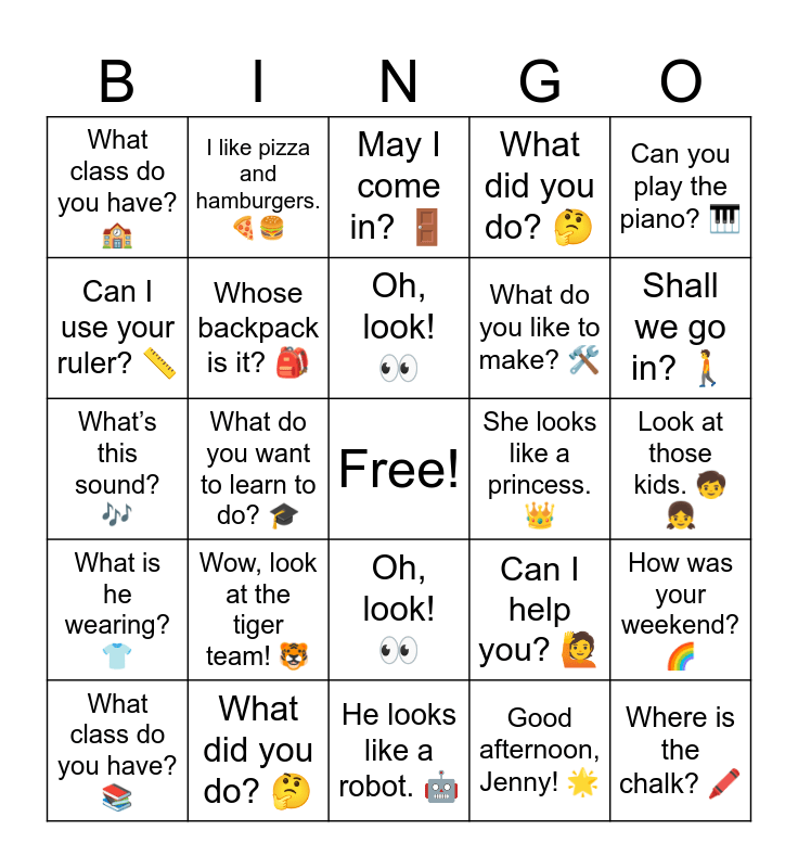 This bingo card has a free space and 30 words: What did you do? π€, How was your weekend? π, What do you want to learn to do? π, Letβs do some afterschool activities. π¨, What class do you have? π«, May I come in? πͺ, Whose backpack is it? π, Oh, look! π, She looks like a princess. π, He looks like a robot. π€, Look at those kids. π§π§, Where is the chalk? ποΈ, Good afternoon, Jenny! π, What is she doing? ποΈ, Shall we go in? πΆ, Do you need purple bananas? ππ, Can I help you? π, What is he wearing? π, Wow, look at the tiger team! π―, Can you play the piano? πΉ, Whatβs this sound? πΆ, Cut the paper. βοΈ, I like pizza and hamburgers. ππ, What do you like to make? π οΈ, Can I use your ruler? π, What did you do? π€, How was your weekend? π, What class do you have? π, Oh, look! π and What is he doing? π.