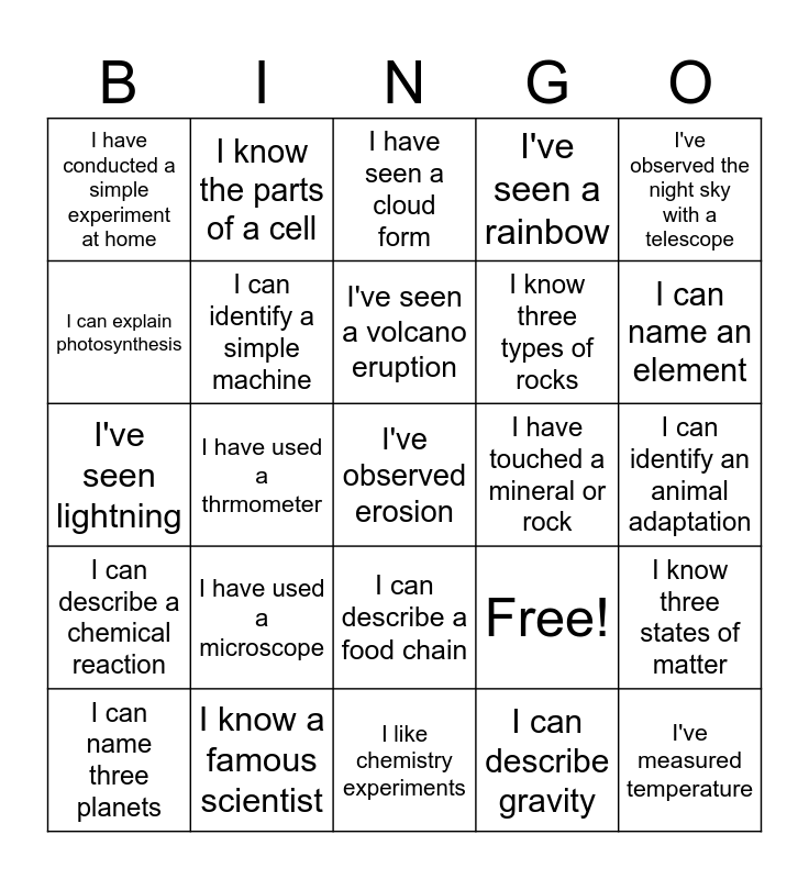 This bingo card has 25 words: I have used a microscope, I like chemistry experiments, I've seen a volcano eruption, I can name three planets, I've observed the night sky with a telescope, I have conducted a simple experiment at home, I can explain photosynthesis, I know the parts of a cell, I have touched a mineral or rock, I can describe a food chain, I know three types of rocks, I've seen lightning, Free!, I know three states of matter, I can identify a simple machine, I've measured temperature, I can identify an animal adaptation, I have seen a cloud form, I can name an element, I have used a thrmometer, I've observed erosion, I know a famous scientist, I can describe a chemical reaction, I've seen a rainbow and I can describe gravity.