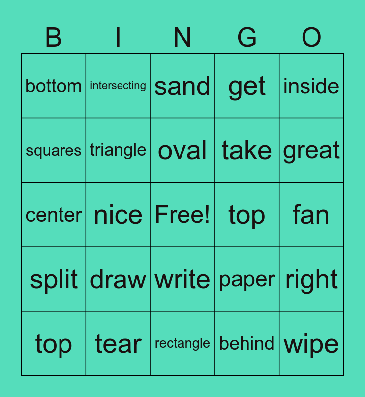 This bingo card has a free space and 25 words: draw, rectangle, oval, top, inside, bottom, squares, intersecting, top, write, take, center, paper, right, triangle, glass, fan, sand, great, nice, wipe, tear, split, get and behind.