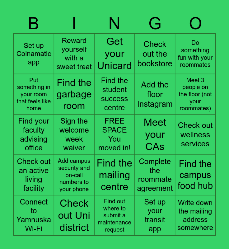 This bingo card has a free space and 24 words: Add campus security and on-call numbers to your phone, Check out Uni district, Find the student success centre, Connect to Yamnuska Wi-Fi, Do something fun with your roommates, Set up Coinamatic app, Put something in your room that feels like home, Reward yourself with a sweet treat, Meet your CAs, Find the mailing centre, Add the floor Instagram, Find your faculty advising office, Complete the roommate agreement, Find the campus food hub, Find the garbage room, Set up your transit app, Check out wellness services, Get your Unicard, Meet 3 people on the floor (not your roommates), Sign the welcome week waiver, Write down the mailing address somewhere, Check out an active living facility, Check out the bookstore and Find out where to submit a maintenance request.