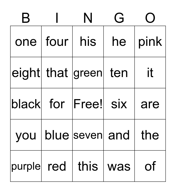 This bingo card has a free space and 24 words: blue, red, green, purple, pink, one, eight, four, six, seven, ten, black, and, the, that, was, are, his, it, for, of, you, he and this.