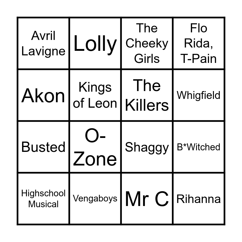 This bingo card has 16 words: Vengaboys, B*Witched, The Cheeky Girls, Avril Lavigne, Busted, Lolly, Shaggy, Mr C, Akon, Kings of Leon, Highschool Musical, Flo Rida, T-Pain, O-Zone, Whigfield, The Killers and Rihanna.
