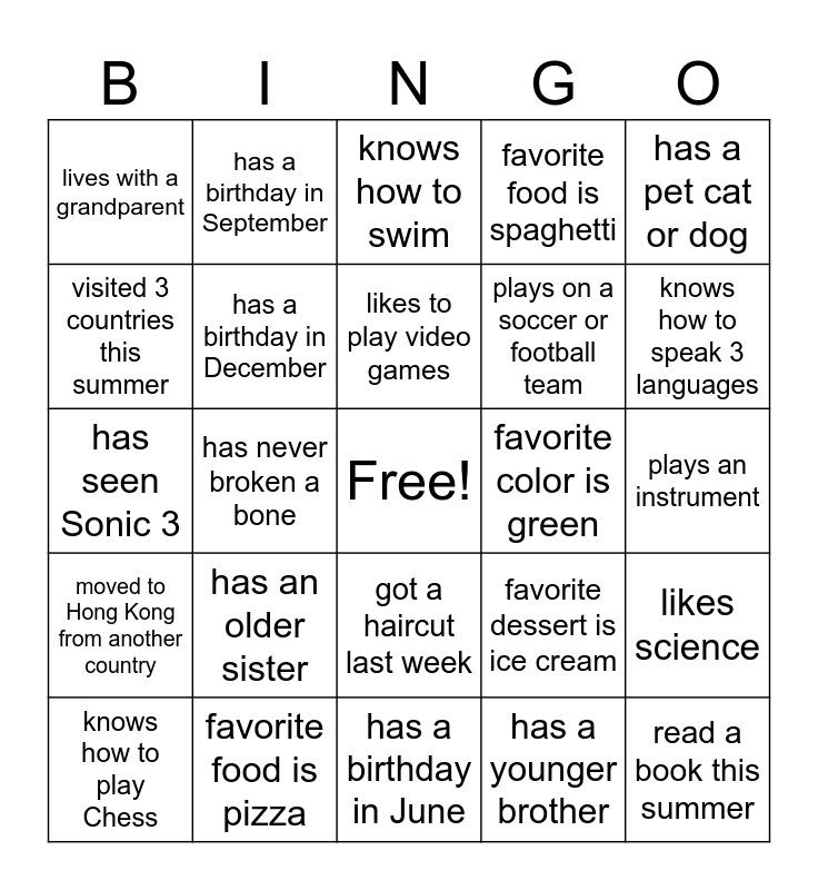 This bingo card has a free space and 24 words: has an older sister, favorite food is pizza, likes to play video games, knows how to play Chess, has a pet cat or dog, lives with a grandparent, visited 3 countries this summer, has a birthday in September, favorite color is green, got a haircut last week, plays on a soccer or football team, has seen Sonic 3, favorite dessert is ice cream, likes science, has a birthday in December, has a younger brother, plays an instrument, knows how to swim, knows how to speak 3 languages, has never broken a bone, read a book this summer, moved to Hong Kong from another country, favorite food is spaghetti and has a birthday in June.