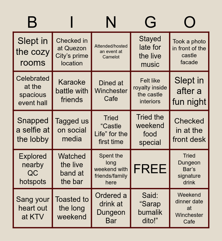 This bingo card has 25 words: Watched the live band at the bar, Ordered a drink at Dungeon Bar, Dined at Winchester Cafe, Sang your heart out at KTV, Took a photo in front of the castle facade, Slept in the cozy rooms, Celebrated at the spacious event hall, Checked in at Quezon City’s prime location, Tried the weekend food special, Spent the long weekend with friends/family here, Felt like royalty inside the castle interiors, Snapped a selfie at the lobby, FREE, Tried Dungeon Bar’s signature drink, Karaoke battle with friends, Weekend dinner date at Winchester Cafe, Checked in at the front desk, Attended/hosted an event at Camelot, Slept in after a fun night, Tagged us on social media, Tried “Castle Life” for the first time, Toasted to the long weekend, Explored nearby QC hotspots, Stayed late for the live music and Said: “Sarap bumalik dito!”.