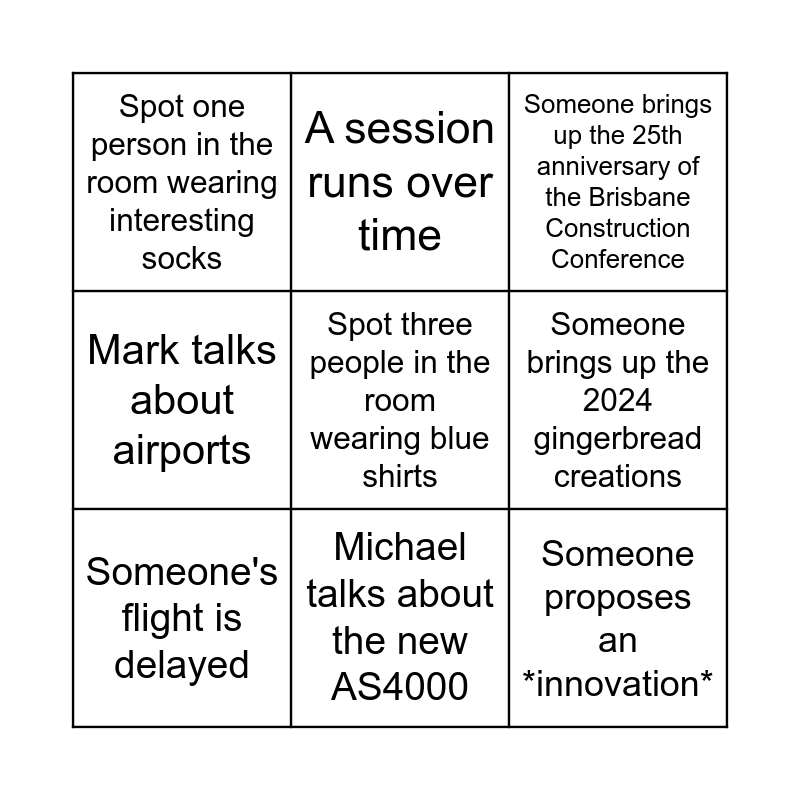 This bingo card has 35 words: Strati cracks a smile, Someone mixes up Charlotte and Rachel, Someone is late coming back from lunch, Someone's flight is delayed, Matt mentions Rockhampton, Mark talks about airports, Someone brings up the 2024 gingerbread creations, Someone forgets which room they're meant to be in, Michael talks about the new AS4000, A powerpoint malfunctions, Someone takes a call during one of the sessions, Spot three people in the room wearing blue shirts, Spot four people in the room wearing RM Williams, Spot two people in the room wearing puffer vests, Spot one person in the room wearing interesting socks, Work the phrase 'the chickens are coming home to roost' into conversation without being obvious, Work the phrase 'a rolling stone gathers no moss' into conversation without being obvious, Work the phrase 'Unlocking Success. Together' into conversation without being obvious, Work the phrase 'Queen Street Cowboys' into conversation without being obvious, Someone mentions the Iris matter, James makes an insightful comment, Someone mentions Unfair Contract Terms, Someone mentions Pro Bono hours, Someone talks about the 100 year celebration next year, Someone brings up the 25th anniversary of the Brisbane Construction Conference, Someone talks about concrete, Someone uses a meme in their powerpoint slide, Chris talks about UGL, Someone proposes an *innovation*, Someone asks the group to consider *innovations*, Someone gets 10/10 on their client feedback, Someone talks about the Olympics, Someone talks about River to Rooftop, A session runs over time and A session runs under time.