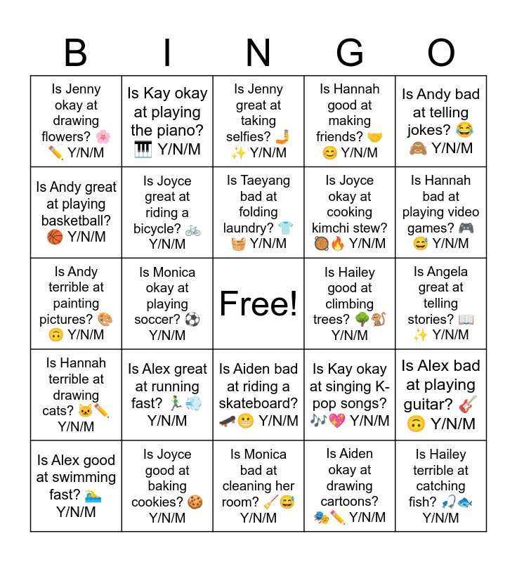 This bingo card has a free space and 33 words: Is Jenny good at singing karaoke? ๐ค Y/N/M, Is Angela bad at cooking ramen? ๐ Y/N/M, Is Monica okay at playing soccer? โฝ Y/N/M, Is Hailey good at dancing in the rain? ๐ง๏ธ๐ Y/N/M, Is Hannah terrible at drawing cats? ๐ฑโ๏ธ Y/N/M, Is Joyce great at riding a bicycle? ๐ฒ Y/N/M, Is Andy bad at telling jokes? ๐๐ Y/N/M, Is Alex good at swimming fast? ๐โโ๏ธ Y/N/M, Is Kay okay at playing the piano? ๐น Y/N/M, Is Aiden good at eating spicy food? ๐ถ๏ธ๐ฅ Y/N/M, Is Taeyang bad at folding laundry? ๐๐งบ Y/N/M, Is Jenny great at taking selfies? ๐คณโจ Y/N/M, Is Angela terrible at ice skating? โธ๏ธ Y/N/M, Is Monica okay at speaking English? ๐๐ฌ๐ง Y/N/M, Is Hailey good at climbing trees? ๐ณ๐ Y/N/M, Is Hannah bad at playing video games? ๐ฎ๐ Y/N/M, Is Joyce good at baking cookies? ๐ช Y/N/M, Is Andy terrible at painting pictures? ๐จ๐ Y/N/M, Is Alex great at running fast? ๐โโ๏ธ๐จ Y/N/M, Is Kay okay at singing K-pop songs? ๐ถ๐ Y/N/M, Is Aiden bad at riding a skateboard? ๐น๐ฌ Y/N/M, Is Taeyang good at eating ice cream? ๐ฆ๐ Y/N/M, Is Jenny okay at drawing flowers? ๐ธโ๏ธ Y/N/M, Is Angela great at telling stories? ๐โจ Y/N/M, Is Monica bad at cleaning her room? ๐งน๐ Y/N/M, Is Hailey terrible at catching fish? ๐ฃ๐ Y/N/M, Is Hannah good at making friends? ๐ค๐ Y/N/M, Is Joyce okay at cooking kimchi stew? ๐ฅ๐ฅ Y/N/M, Is Andy great at playing basketball? ๐ Y/N/M, Is Alex bad at playing guitar? ๐ธ๐ Y/N/M, Is Kay terrible at remembering names? ๐ค๐ Y/N/M, Is Aiden okay at drawing cartoons? ๐ญโ๏ธ Y/N/M and Is Taeyang great at dancing on stage? ๐๐ต Y/N/M.
