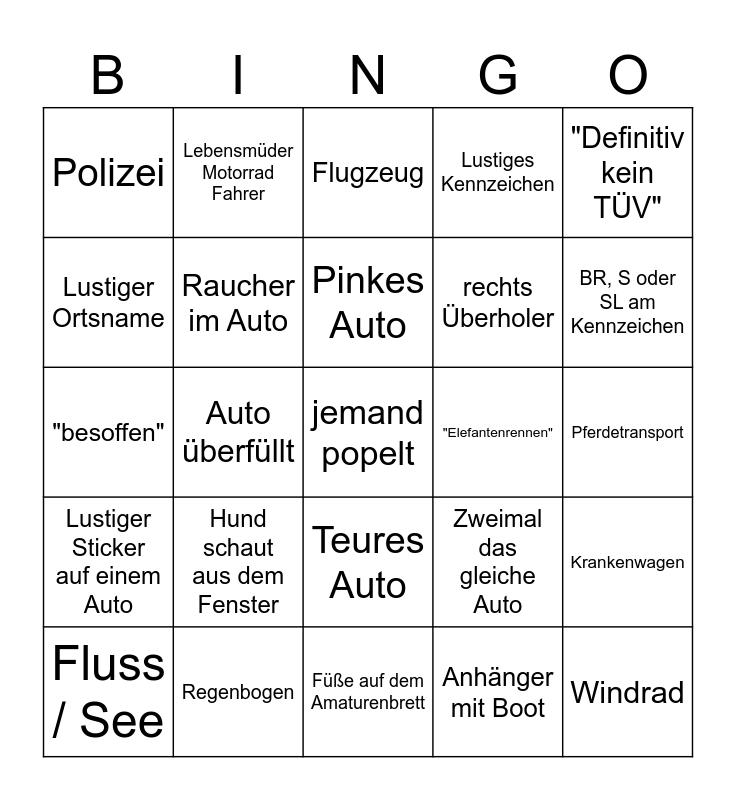 This bingo card has 25 words: Hund schaut aus dem Fenster, Füße auf dem Amaturenbrett, Pinkes Auto, Fluss / See, "Definitiv kein TÜV", Polizei, Lustiger Ortsname, Lebensmüder Motorrad Fahrer, "Elefantenrennen", Teures Auto, rechts Überholer, "besoffen", Zweimal das gleiche Auto, Krankenwagen, Raucher im Auto, Windrad, Pferdetransport, Flugzeug, BR, S oder SL am Kennzeichen, Auto überfüllt, jemand popelt, Regenbogen, Lustiger Sticker auf einem Auto, Lustiges Kennzeichen and Anhänger mit Boot.