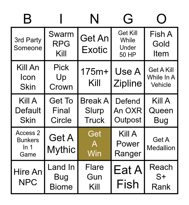 This bingo card has 36 words: Dance After A Kill, Kill A Marvel Skin, Killed By Anonymous, Use A Zipline, Get A Medallion, Hire An NPC, Pick Up Crown, 2nd Place, Get Kill While Under 50 HP, Killed By YT/TT/TTV, Kill A Default Skin, Swarm RPG Kill, Get A Win, Eat A Fish, Kill A Queen Bug, 3rd Party Someone, Land In Bug Biome, Get An Exotic, Kill A Power Ranger, Fish A Gold Item, Access 2 Bunkers In 1 Game, Get A Mythic, 175m+ Kill, Pickaxe Kill, Reach S+ Rank, Kill An Icon Skin, Get To Final Circle, Flare Gun Kill, Defend An OXR Outpost, Get A Kill While In A Vehicle, Die To Fall Damage, First Kill In Match, Break A Slurp Truck, Hit By A Car, Open A Rare Chest and 6+ Kill Game.