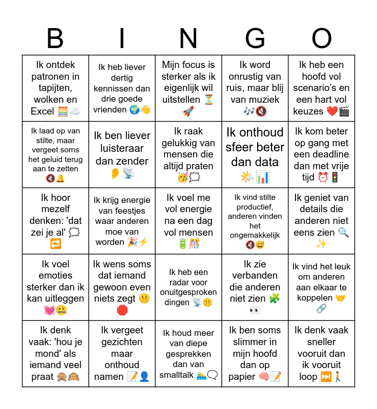 This bingo card has 160 words: Free!, Ik vind lijstjes maken leuker dan ze afwerken โ๏ธ๐, Mijn hoofd is drukker dan de koffieautomaat op maandagochtend โ๏ธ๐, Ik krijg energie van plannen, totdat iemand het plan verandert ๐ โก, Mijn creativiteit piekt altijd als ik eigenlijk moet slapen ๐๐ก, Ik word blij van orde, zelfs in mijn chaotische gedachten ๐๏ธ๐ช๏ธ, Ik onthoud meer details dan ik ooit nodig heb ๐๐ง , Ik ga liever te diep dan te breed in een onderwerp ๐โโ๏ธ๐, Ik doe ideeรซn op onder de douche ๐ฟ๐ญ, Mijn brein denkt sneller dan ik kan praten ๐คฏ๐ฌ, Ik laad op van stilte, maar vergeet soms het geluid terug aan te zetten ๐๐, Ik bedenk de slimste dingen als niemand erom vraagt ๐ฏ๐ , Mijn focus is sterker als ik eigenlijk wil uitstellen โณ๐, Ik praat met mezelf in mijn hoofd, en soms hardop ๐๐ฃ๏ธ, Ik zie verbanden die anderen niet zien ๐งฉ๐, Ik krijg stress van kleine dingen, en rust van grote ๐ช๏ธ๐ฑ, Ik heb meer ideeรซn dan ik ooit kan uitvoeren ๐ก๐ฆ, Mijn hoofd maakt sneller scenarioโs dan Netflix ๐บโก, Ik vergeet waar mijn sleutels liggen, maar niet waar mijn dromen liggen ๐๐, Ik leer het liefst op mijn eigen manier ๐ ๏ธ๐งญ, Ik ben beter in denken dan in stoppen met denken ๐ง ๐, Ik voel me slim in chaos en soms dom in orde ๐๐, Ik verzamel meer kennis dan ik kan gebruiken ๐๐, Mijn hoofd is een achtbaan waar ik zelf in de rij sta ๐ข๐, Ik praat sneller dan mijn gedachten kunnen volgen ๐ฃ๏ธ๐, Ik heb altijd een plan B, soms al tot plan Z ๐ ฑ๏ธ๐ก, Ik ontdek patronen in tapijten, wolken en Excel ๐งฎโ๏ธ, Ik voel me fijner in stilte dan in smalltalk ๐คซ๐ฅ, Ik kom tot mijn beste ideeรซn tijdens een wandeling ๐ถ๐ณ, Ik bedenk slimme oplossingen, maar vergeet soms de vraag ๐โ, Ik ga eerder voor diepgang dan voor snelheid ๐ช๐, Ik ben sneller moe van mensen dan van puzzels ๐งฉ๐ด, Ik vind focus moeilijker dan multitasken ๐๏ธ๐ง, Ik houd meer van inspiratie dan van instructie ๐จ๐, Ik vind prikkels soms lekker, soms slopend โก๐ซ, Ik leer sneller door te doen dan door te luisteren ๐ ๏ธ๐, Ik raak verdwaald in mijn gedachten en vind daar schatten ๐บ๏ธ๐, Ik onthoud gezichten beter dan namen ๐๐ง, Ik word blij van nieuwe ideeรซn, maar moe van details ๐ฑ๐, Ik heb vaker een hoofd vol plannen dan een lege agenda ๐ ๐งฉ, Ik kom beter op gang met een deadline dan met vrije tijd โฐ๐ฆ, Ik geniet stiekem van nerdy details ๐ค๐ฌ, Ik ben beter in dromen dan in opruimen ๐๐งน, Ik vind verandering spannend รฉn leuk tegelijk ๐ข๐, Ik heb vaak meer tabbladen open in mijn hoofd dan op mijn laptop ๐ป๐ง , Ik praat liever รฉรฉn-op-รฉรฉn dan in een groep ๐ค๐ฅ, Ik snap soms sneller de kern dan de context ๐ฏ๐, Ik werk liever slim dan hard ๐ง ๐ช, Ik voel me creatief met chaos en veilig met structuur ๐๐, Ik luister beter als ik mag bewegen ๐ถ๐ง, Ik verlies me sneller in een idee dan in een gesprek ๐ก๐จ๏ธ, Ik heb soms een hoofd vol energie en een lichaam vol moeheid ๐๐ด, Ik vergeet afspraken, maar niet mijn passies ๐๐ฅ, Ik ben soms slimmer in mijn hoofd dan op papier ๐ง ๐, Ik geniet van brainstorms, maar niet van de uitwerking ๐ฉ๏ธโ๏ธ, Ik denk vaak sneller vooruit dan ik vooruit loop โญ๏ธ๐ถ, Ik laad op van alleen zijn, ook al vind ik anderen leuk ๐ฑ๐, Ik werk liever met vrijheid dan met controle ๐๏ธ๐, Ik voel me soms meer thuis in mijn hoofd dan in een ruimte ๐ ๐ง , Ik kan beter analyseren dan improviseren ๐ง๐ญ, Ik geniet van details die anderen niet eens zien ๐โจ, Ik word onrustig van ruis, maar blij van muziek ๐ถ๐, Ik heb een talent voor overdenken ๐๐ค, Ik vind inspiratie in vreemde plekken โ๏ธ๐ก, Ik maak sneller associaties dan conclusies ๐โ, Ik onthoud sfeer beter dan data ๐ค๏ธ๐, Ik vind verrassing leuker dan voorspelbaarheid ๐๐ , Ik heb soms meer fantasie dan focus ๐๐ฆ, Ik voel me slimmer in de avond dan in de ochtend ๐โ, Ik vind stilte productief, anderen vinden het ongemakkelijk ๐๐ , Ik werk liever vanuit vragen dan vanuit antwoorden โ๐, Ik vind variatie fijn, maar routine geruststellend ๐ฒ๐, Ik doe liever iets nieuws dan iets bekends ๐๐, Ik voel emoties sterker dan ik kan uitleggen ๐๐ค, Ik onthoud zinnen uit gesprekken jaren later ๐ฃ๏ธ๐๏ธ, Ik vind beeldspraak makkelijker dan cijfers ๐จ๐ข, Ik heb een radar voor onuitgesproken dingen ๐ก๐คซ, Ik schrijf liever dan dat ik praat โ๏ธ๐จ๏ธ, Ik ga soms te diep in details en mis de grote lijn ๐ณ๏ธ๐, Ik voel me beter met een lijstje in mijn zak ๐๏ธ๐, Ik verzin liever oplossingen dan dat ik regels volg ๐ก๐, Ik heb een hoofd vol scenarioโs en een hart vol keuzes โค๏ธ๐ฌ, Ik vind brainstormen leuker dan evalueren ๐ช๏ธ๐, Ik zoek liever naar betekenis dan naar winst ๐๐, Ik onthoud geluiden beter dan cijfers ๐ง๐ข, Ik voel me vaak sneller verbonden met ideeรซn dan met mensen ๐ค๐ก, Ik raak sneller verveeld door herhaling ๐๐ฅฑ, Ik geniet van complexiteit meer dan van eenvoud ๐งฉ๐ข, Ik heb soms meer focus op details dan op tijd ๐ฐ๏ธ๐, Ik denk in beelden, zelfs als ik woorden hoor ๐ผ๏ธ๐ฃ๏ธ, Ik werk beter met een heldere richting dan met vage doelen ๐งญโ๏ธ, Ik voel me creatiever als ik niets moet ๐จ๐ซ, Ik ga liever op gevoel dan op regels ๐๐, Ik leer sneller van fouten dan van succes โโ , Ik geniet meer van de reis dan van de bestemming ๐๐ , Ik ben sneller enthousiast dan ik kan uitleggen ๐คฉ๐จ๏ธ, Ik heb soms meer vragen dan 