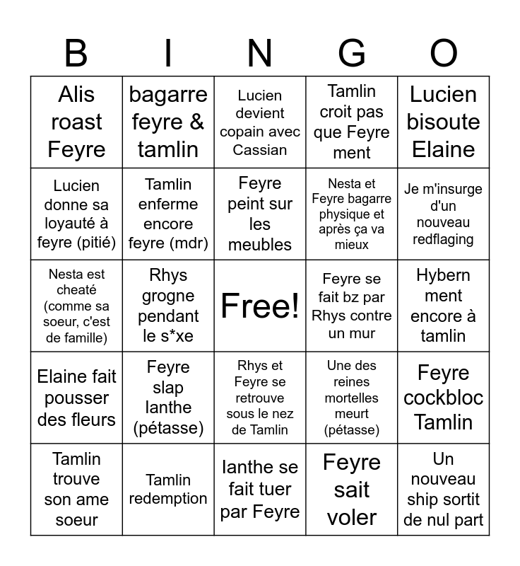 This bingo card has a free space and 24 words: Feyre slap Ianthe (pétasse), Tamlin redemption, Feyre peint sur les meubles, Tamlin trouve son ame soeur, Lucien bisoute Elaine, Alis roast Feyre, Lucien donne sa loyauté à feyre (pitié), bagarre feyre & tamlin, Feyre se fait bz par Rhys contre un mur, Rhys et Feyre se retrouve sous le nez de Tamlin, Nesta et Feyre bagarre physique et après ça va mieux, Nesta est cheaté (comme sa soeur, c'est de famille), Une des reines mortelles meurt (pétasse), Feyre cockbloc Tamlin, Tamlin enferme encore feyre (mdr), Feyre sait voler, Hybern ment encore à tamlin, Lucien devient copain avec Cassian, Je m'insurge d'un nouveau redflaging, Rhys grogne pendant le s*xe, Un nouveau ship sortit de nul part, Elaine fait pousser des fleurs, Tamlin croit pas que Feyre ment and Ianthe se fait tuer par Feyre.