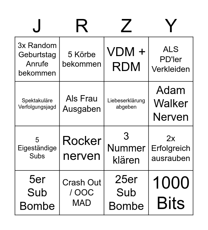 This bingo card has 16 words: 5er Sub Bombe, Crash Out / OOC MAD, VDM + RDM, ALS PD'ler Verkleiden, Spektakuläre Verfolgungsjagd, 5 Körbe bekommen, 3 Nummer klären, 2x Erfolgreich ausrauben, 3x Random Geburtstag Anrufe bekommen, Als Frau Ausgaben, 25er Sub Bombe, Adam Walker Nerven, 5 Eigeständige Subs, Rocker nerven, Liebeserklärung abgeben and 1000 Bits.