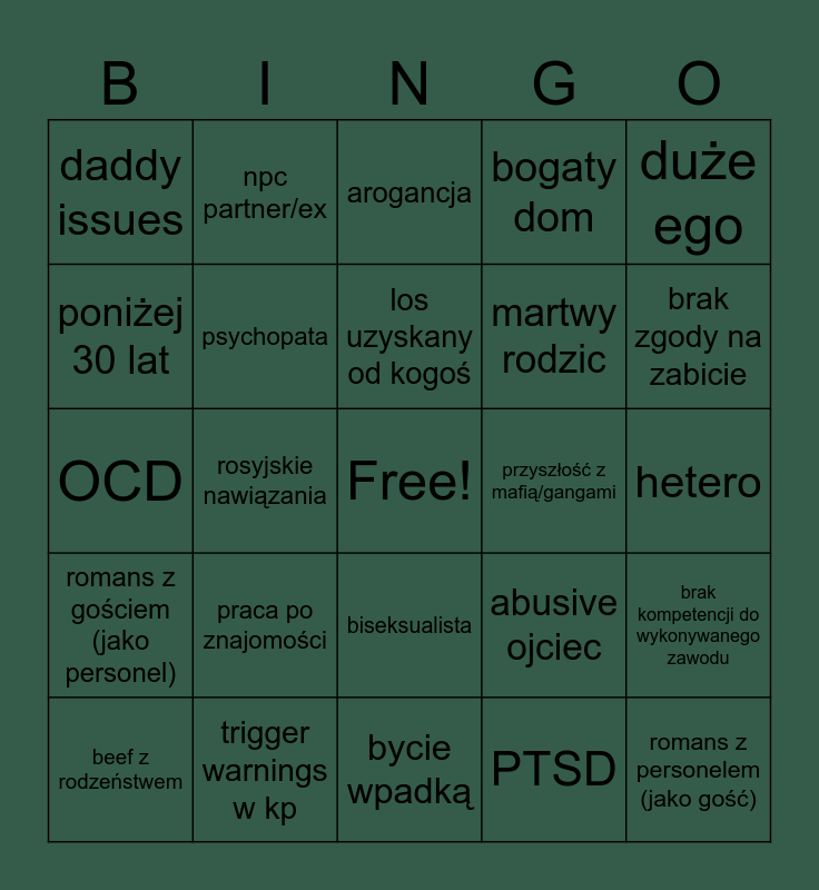 This bingo card has a free space and 24 words: praca po znajomości, trigger warnings w kp, los uzyskany od kogoś, beef z rodzeństwem, duże ego, daddy issues, poniżej 30 lat, npc partner/ex, przyszłość z mafią/gangami, biseksualista, martwy rodzic, OCD, abusive ojciec, brak kompetencji do wykonywanego zawodu, psychopata, PTSD, hetero, arogancja, brak zgody na zabicie, rosyjskie nawiązania, romans z personelem (jako gość), romans z gościem (jako personel), bogaty dom and bycie wpadką.
