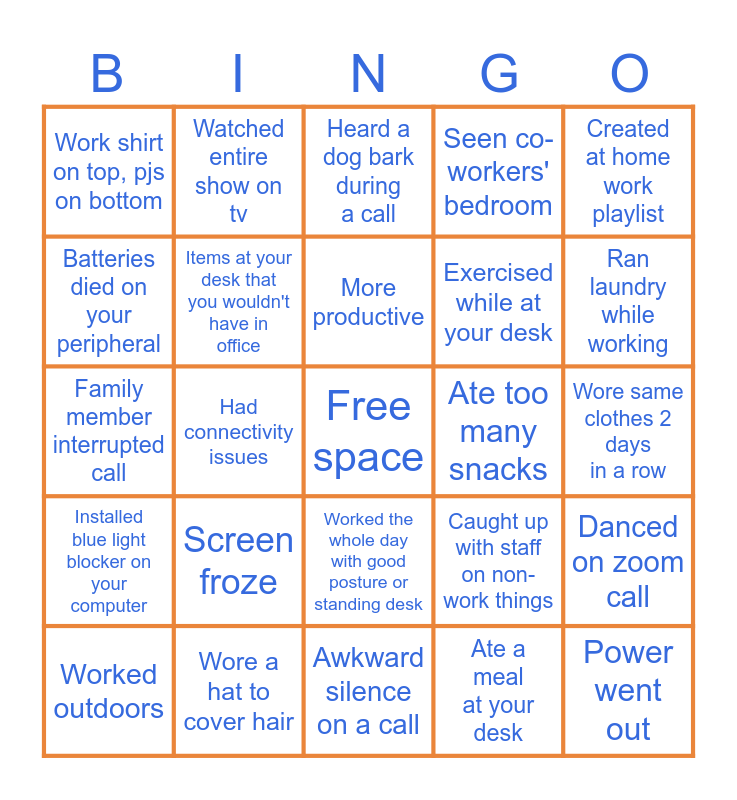 This bingo card has a free space and 29 words: Worked outdoors, Got distracted by outside noise, Had connectivity issues, Grateful for not dealing with rush hour, Work shirt on top, pjs on bottom, Heard a dog bark during a call, Items at your desk that you wouldn't have in office, Screen froze, Ate too many snacks, Wore a hat to cover hair, Wore same clothes 2 days in a row, Power went out, Awkward silence on a call, Ate a meal at your desk, Ran laundry while working, Stood up at least once an hour, Worked the whole day with good posture or standing desk, Installed blue light blocker on your computer, Created at home work playlist, Family member interrupted call, Caught up with staff on non-work things, Customized a virtual background, Exercised while at your desk, Batteries died on your peripheral, Seen co-workers' bedroom, Watched entire show on tv, Danced on zoom call, More productive and Tidy up home.