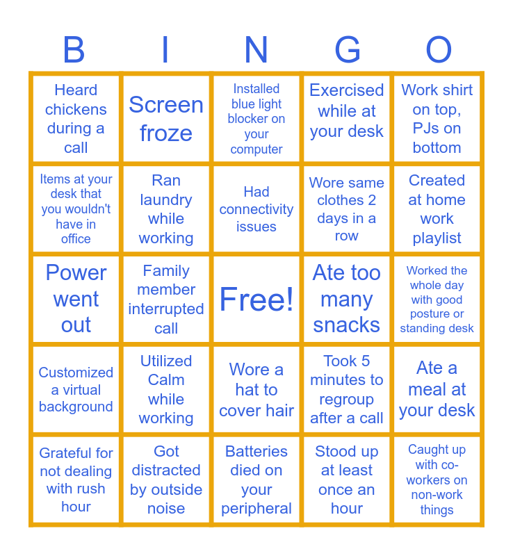 This bingo card has a free space and 24 words: Utilized Calm while working, Got distracted by outside noise, Had connectivity issues, Grateful for not dealing with rush hour, Work shirt on top, PJs on bottom, Heard chickens during a call, Items at your desk that you wouldn't have in office, Screen froze, Ate too many snacks, Wore a hat to cover hair, Wore same clothes 2 days in a row, Power went out, Took 5 minutes to regroup after a call, Ate a meal at your desk, Ran laundry while working, Stood up at least once an hour, Worked the whole day with good posture or standing desk, Installed blue light blocker on your computer, Created at home work playlist, Family member interrupted call, Caught up with co-workers on non-work things, Customized a virtual background, Exercised while at your desk and Batteries died on your peripheral.