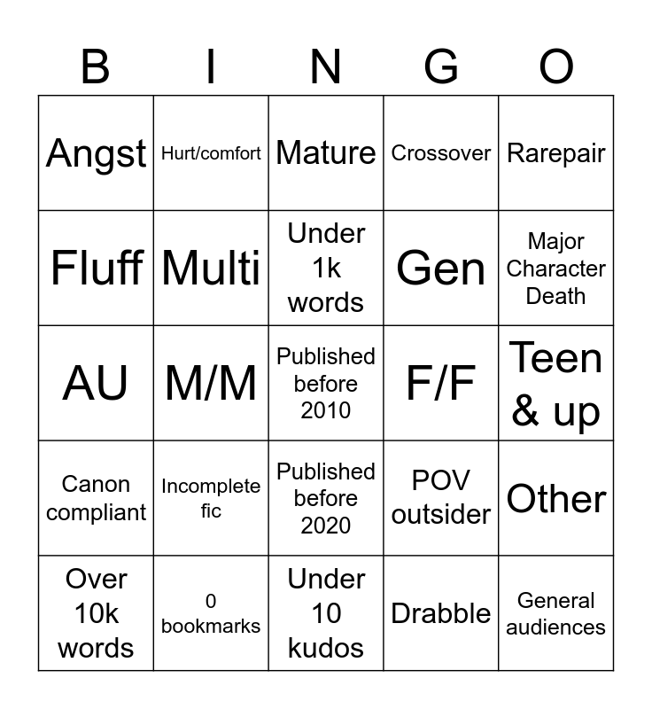 This bingo card has 25 words: Incomplete fic, Under 10 kudos, Under 1k words, Over 10k words, Rarepair, Angst, Fluff, Hurt/comfort, F/F, Published before 2020, Gen, AU, POV outsider, Other, Multi, General audiences, Teen & up, Mature, Major Character Death, M/M, Published before 2010, 0 bookmarks, Canon compliant, Crossover and Drabble.