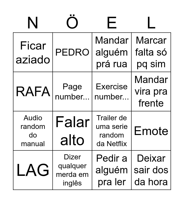 This bingo card has 16 words: Dizer qualquer merda em inglês, Emote, Mandar alguém prá rua, Ficar aziado, Audio random do manual, PEDRO, Trailer de uma serie random da Netflix, Pedir a alguém pra ler, RAFA, Page number..., LAG, Marcar falta só pq sim, Falar alto, Mandar vira pra frente, Exercise number... and Deixar sair dos da hora.