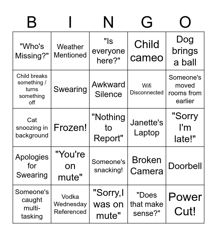 This bingo card has a free space and 24 words: "You're on mute", Vodka Wednesday Referenced, Awkward Silence, Someone's caught multi-tasking, Dog brings a ball, "Who's Missing?", Child breaks something / turns something off, Weather Mentioned, Janette's Laptop, Someone's snacking!, Wifi Disconnected, Cat snoozing in background, Broken Camera, Doorbell, Swearing, "Does that make sense?", "Sorry I'm late!", "Is everyone here?", Someone's moved rooms from earlier, Frozen!, Power Cut!, Apologies for Swearing, Child cameo and "Sorry,I was on mute".