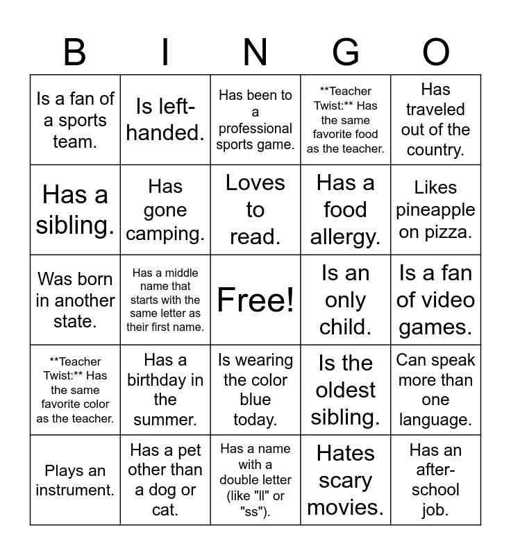 This bingo card has a free space and 24 words: Has a birthday in the summer., Has a pet other than a dog or cat., Loves to read., Plays an instrument., Has traveled out of the country., Is a fan of a sports team., Has a sibling., Is left-handed., Is an only child., Is wearing the color blue today., Has a food allergy., Was born in another state., Is the oldest sibling., Can speak more than one language., Has gone camping., Hates scary movies., Is a fan of video games., Has been to a professional sports game., Likes pineapple on pizza., Has a middle name that starts with the same letter as their first name., Has an after-school job., **Teacher Twist:** Has the same favorite color as the teacher., **Teacher Twist:** Has the same favorite food as the teacher. and Has a name with a double letter (like "ll" or "ss")..