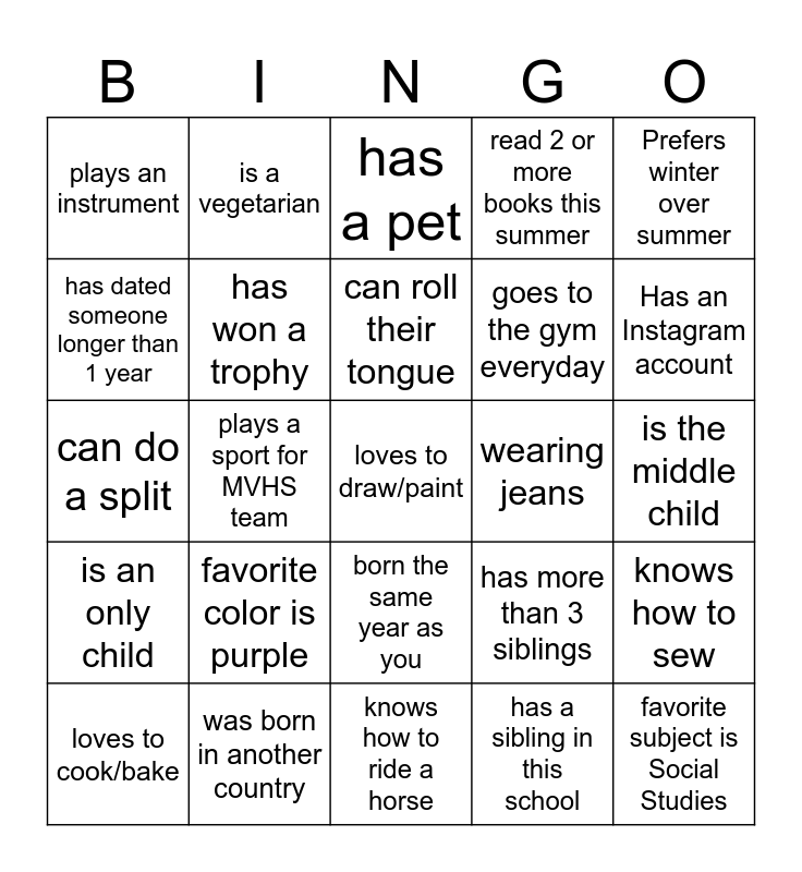 This bingo card has 30 words: was born in another country, has traveled outside of the US, plays a sport for MVHS team, speaks 3 languages, plays an instrument, has a pet, has won a trophy, born the same year as you, wearing jeans, knows how to ride a horse, is the middle child, loves to draw/paint, has a sibling in this school, favorite subject is Social Studies, Has an Instagram account, has a living grandparent over 70, has more than 3 siblings, is an only child, favorite color is purple, Prefers winter over summer, can do a split, loves seafod, is a vegetarian, goes to the gym everyday, has dated someone longer than 1 year, read 2 or more books this summer, knows how to sew, loves to cook/bake, can roll their tongue and has a job.