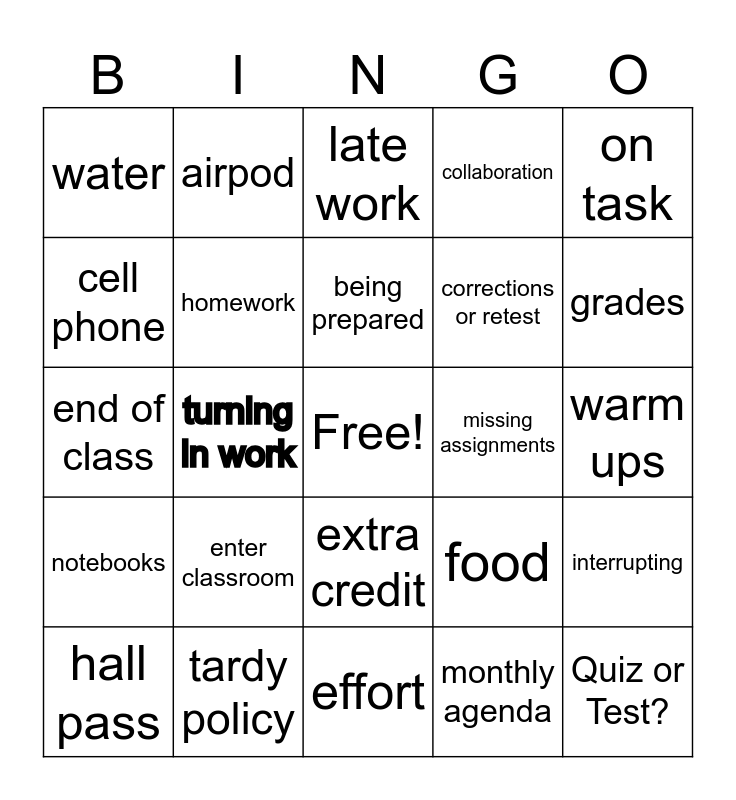 This bingo card has a free space and 24 words: enter classroom, tardy policy, being prepared, hall pass, on task, water, cell phone, airpod, missing assignments, extra credit, corrections or retest, end of class, food, interrupting, homework, monthly agenda, warm ups, late work, grades, turning in work, Quiz or Test?, notebooks, collaboration and effort.