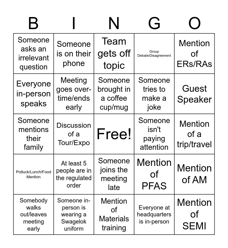 This bingo card has a free space and 24 words: At least 5 people are in the regulated order, Someone in-person is wearing a Swagelok uniform, Someone brought in a coffee cup/mug, Somebody walks out/leaves meeting early, Mention of ERs/RAs, Someone asks an irrelevant question, Everyone in-person speaks, Someone is on their phone, Someone isn't paying attention, Someone joins the meeting late, Someone tries to make a joke, Someone mentions their family, Mention of PFAS, Mention of AM, Meeting goes over-time/ends early, Everyone at headquarters is in-person, Mention of a trip/travel, Team gets off topic, Guest Speaker, Discussion of a Tour/Expo, Mention of SEMI, Potluck/Lunch/Food Mention, Group Debate/Disagreement and Mention of Materials training.