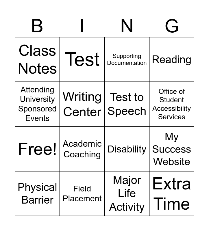 This bingo card has 20 words: My Success Website, Equal Access, Supporting Documentation, Living on Campus, Physical Barrier, Attending University Sponsored Events, Field Placement, Class Notes, Free!, Test, Academic Coaching, Disability, Writing Center, Extra Time, Test to Speech, Accomodation, Office of Student Accessibility Services, Reading, Major Life Activity and Regarded As.