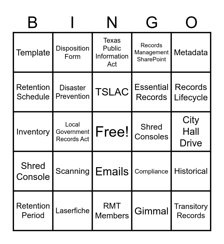 This bingo card has a free space and 24 words: Scanning, Laserfiche, TSLAC, Retention Period, Metadata, Template, Retention Schedule, Disposition Form, Shred Consoles, Emails, Essential Records, Inventory, Compliance, Historical, Disaster Prevention, Gimmal, City Hall Drive, Texas Public Information Act, Records Lifecycle, Local Government Records Act, Transitory Records, Shred Console, Records Management SharePoint and RMT Members.