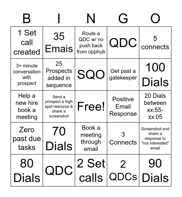 This bingo card has a free space and 24 words: 70 Dials, QDC, SQO, 80 Dials, 5 connects, 1 Set call created, 3+ minute conversation with prospect, 35 Emais, Positive Email Response, Book a meeting through email, Get past a gatekeeper, Help a new hire book a meeting, 3 Connects, Screenshot and share a response to "not interested" email, 25 Prospects added in sequence, 2 QDCs, 20 Dials between xx:55-xx:05, Route a QDC w/ no push back from opphub, 100 Dials, Send a prospect a high spot resource & share a screenshot, 90 Dials, Zero past due tasks, QDC and 2 Set calls.