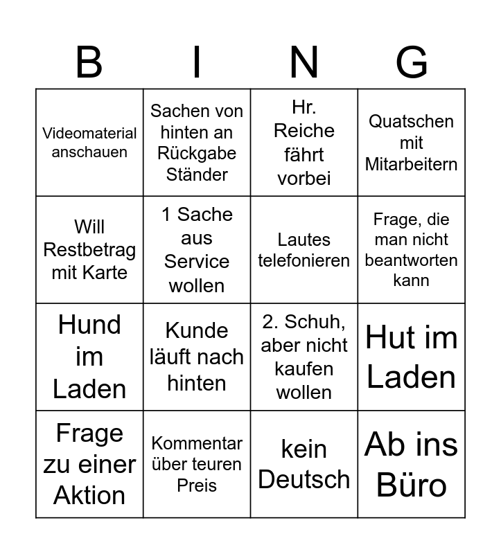 This bingo card has 16 words: Kommentar über teuren Preis, Hut im Laden, Hr. Reiche fährt vorbei, Videomaterial anschauen, Hund im Laden, Sachen von hinten an Rückgabe Ständer, 2. Schuh, aber nicht kaufen wollen, kein Deutsch, Will Restbetrag mit Karte, 1 Sache aus Service wollen, Frage zu einer Aktion, Quatschen mit Mitarbeitern, Kunde läuft nach hinten, Frage, die man nicht beantworten kann, Lautes telefonieren and Ab ins Büro.