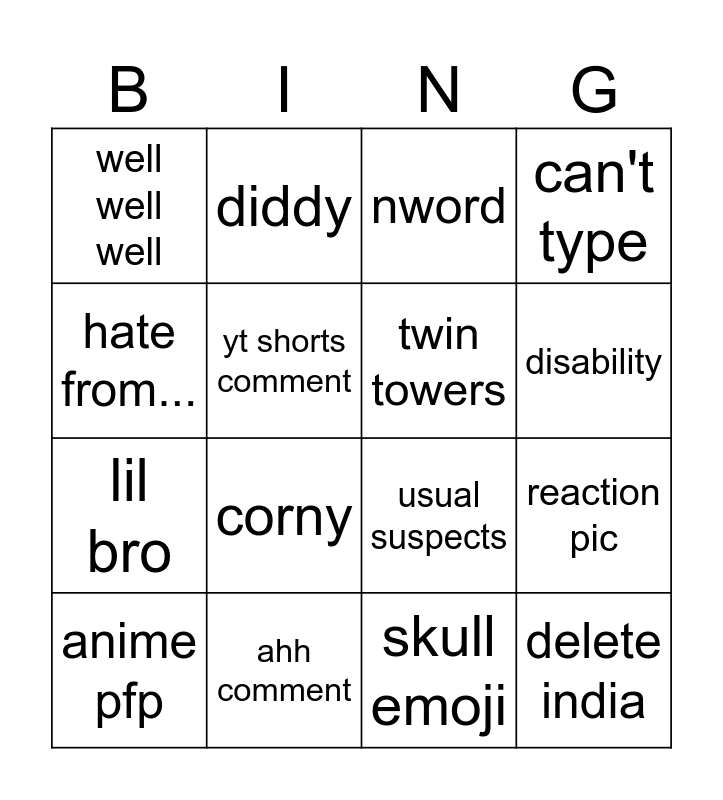 This bingo card has 16 words: ahh comment, reaction pic, nword, well well well, lil bro, diddy, usual suspects, skull emoji, hate from..., yt shorts comment, anime pfp, can't type, corny, disability, twin towers and delete india.