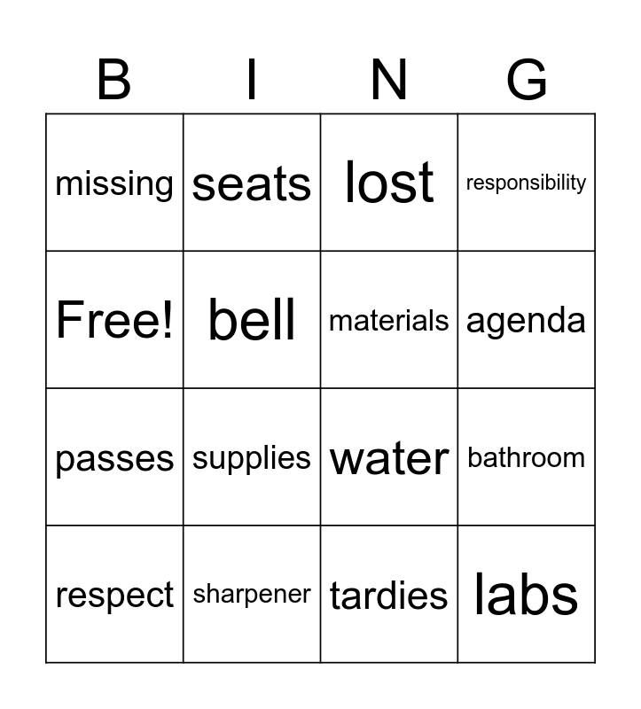 This bingo card has 16 words: sharpener, bathroom, lost, missing, passes, seats, water, tardies, Free!, bell, respect, responsibility, supplies, agenda, materials and labs.