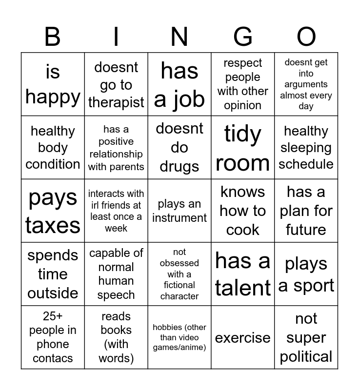 This bingo card has a free space and 24 words: 25+ people in phone contacs, capable of normal human speech, doesnt do drugs, exercise, doesnt get into arguments almost every day, is happy, doesnt go to therapist, has a job, knows how to cook, has a plan for future, pays taxes, has a positive relationship with parents, has a talent, plays a sport, healthy body condition, reads books (with words), hobbies (other than video games/anime), respect people with other opinion, healthy sleeping schedule, spends time outside, interacts with irl friends at least once a week, not obsessed with a fictional character, tidy room and not super political.