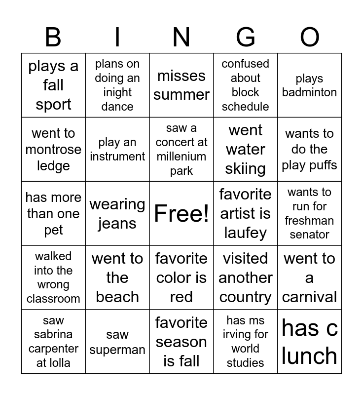 This bingo card has a free space and 24 words: went to the beach, saw superman, saw a concert at millenium park, saw sabrina carpenter at lolla, plays badminton, plays a fall sport, went to montrose ledge, plans on doing an inight dance, favorite artist is laufey, favorite color is red, went water skiing, has more than one pet, visited another country, went to a carnival, play an instrument, has ms irving for world studies, wants to run for freshman senator, misses summer, wants to do the play puffs, wearing jeans, has c lunch, walked into the wrong classroom, confused about block schedule and favorite season is fall.