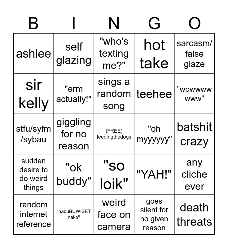 This bingo card has a free space and 24 words: "ok buddy", "nabuBUWISET nako", sings a random song, random internet reference, sarcasm/ false glaze, ashlee, sir kelly, self glazing, "oh myyyyyy", "so loik", teehee, stfu/syfm /sybau, "YAH!", any cliche ever, "erm actually!", goes silent for no given reason, batshit crazy, "who's texting me?", "wowwww www", giggling for no reason, death threats, sudden desire to do weird things, hot take and weird face on camera.