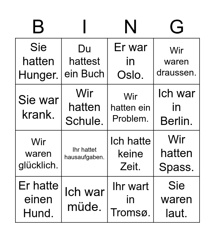This bingo card has 16 words: Ich war müde., Wir hatten Spass., Er war in Oslo., Sie hatten Hunger., Wir waren glücklich., Du hattest ein Buch, Ich hatte keine Zeit., Ihr wart in Tromsø., Sie war krank., Wir hatten Schule., Er hatte einen Hund., Wir waren draussen., Ihr hattet hausaufgaben., Ich war in Berlin., Wir hatten ein Problem. and Sie waren laut..