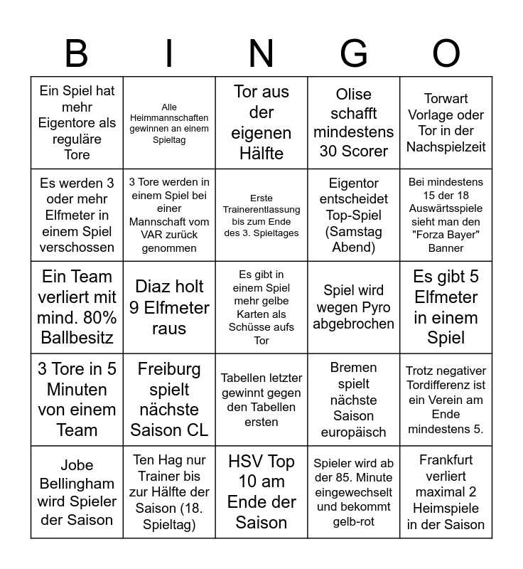 This bingo card has a free space and 24 words: Freiburg spielt nächste Saison CL, Ten Hag nur Trainer bis zur Hälfte der Saison (18. Spieltag), Erste Trainerentlassung bis zum Ende des 3. Spieltages, Jobe Bellingham wird Spieler der Saison, Torwart Vorlage oder Tor in der Nachspielzeit, Ein Spiel hat mehr Eigentore als reguläre Tore, Es werden 3 oder mehr Elfmeter in einem Spiel verschossen, Alle Heimmannschaften gewinnen an einem Spieltag, Spiel wird wegen Pyro abgebrochen, Tabellen letzter gewinnt gegen den Tabellen ersten, Eigentor entscheidet Top-Spiel (Samstag Abend), Ein Team verliert mit mind. 80% Ballbesitz, Bremen spielt nächste Saison europäisch, Trotz negativer Tordifferenz ist ein Verein am Ende mindestens 5., 3 Tore werden in einem Spiel bei einer Mannschaft vom VAR zurück genommen, Spieler wird ab der 85. Minute eingewechselt und bekommt gelb-rot, Es gibt 5 Elfmeter in einem Spiel, Tor aus der eigenen Hälfte, Bei mindestens 15 der 18 Auswärtsspiele sieht man den "Forza Bayer" Banner, Diaz holt 9 Elfmeter raus, Frankfurt verliert maximal 2 Heimspiele in der Saison, 3 Tore in 5 Minuten von einem Team, Olise schafft mindestens 30 Scorer and HSV Top 10 am Ende der Saison.