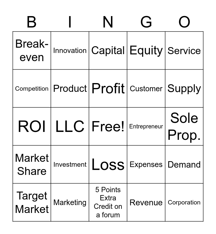 This bingo card has a free space and 24 words: Investment, Marketing, Profit, Target Market, Service, Break-even, Competition, Innovation, Entrepreneur, Loss, Customer, ROI, Expenses, Demand, Product, Revenue, Sole Prop., Capital, Supply, LLC, Corporation, Market Share, Equity and 5 Points Extra Credit on a forum.