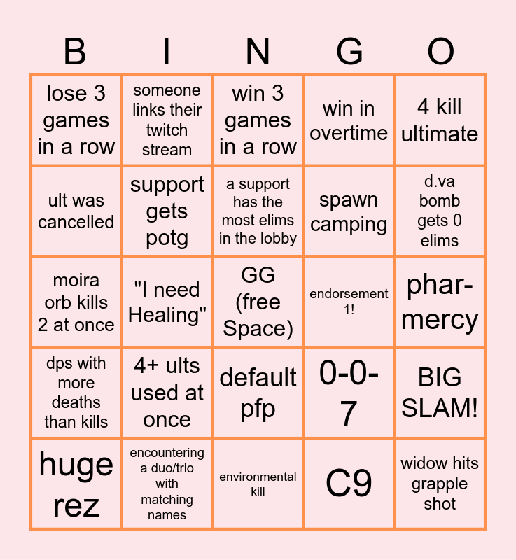 This bingo card has a free space and 34 words: "GG EZ", someone gets zero deaths, mid-off map voting, "tank diff" in chat from enemy team, phar-mercy, ult was cancelled, support gets potg, environmental kill, spawn camping, widow hits grapple shot, moira orb kills 2 at once, someone links their twitch stream, C9, lucio thinks they're frogger, dps with more deaths than kills, "I need Healing", default pfp, endorsement 1!, BIG SLAM!, huge rez, encountering a duo/trio with matching names, ult combo, win in overtime, d.va bomb gets 0 elims, spray/emote in POTG, 4+ ults used at once, win 3 games in a row, a mercy gets nano'd, 4 kill ultimate, lose 3 games in a row, solo-ulted, a support has the most elims in the lobby, 0-0-7 and die during your ult.