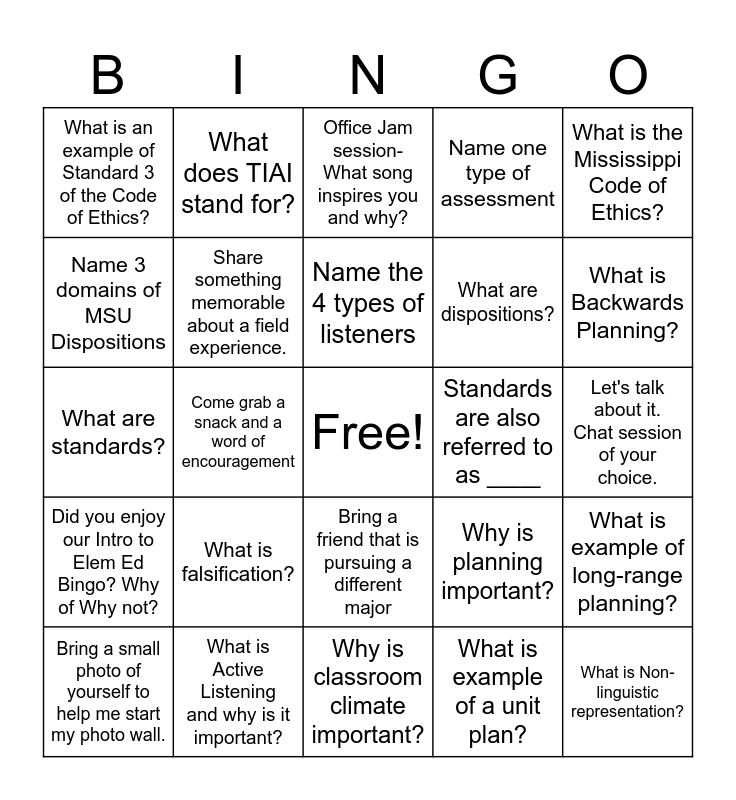 This bingo card has a free space and 24 words: What is falsification?, What is Active Listening and why is it important?, Name the 4 types of listeners, Bring a small photo of yourself to help me start my photo wall., What is the Mississippi Code of Ethics?, What is an example of Standard 3 of the Code of Ethics?, Name 3 domains of MSU Dispositions, What does TIAI stand for?, Standards are also referred to as ____, Bring a friend that is pursuing a different major, What are dispositions?, What are standards?, Why is planning important?, What is example of long-range planning?, Share something memorable about a field experience., What is example of a unit plan?, Let's talk about it. Chat session of your choice., Office Jam session- What song inspires you and why?, What is Backwards Planning?, Come grab a snack and a word of encouragement, What is Non-linguistic representation?, Did you enjoy our Intro to Elem Ed Bingo? Why of Why not?, Name one type of assessment and Why is classroom climate important?.